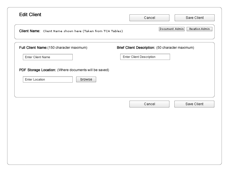 This project was implemented using a Minimum Viable Product strategy in order to get feedback from the end users very early in the implementation of the product. HTML and Javascript protoypes were created to test the layout of the application, and validate the GUI was intuitive to the client services team.