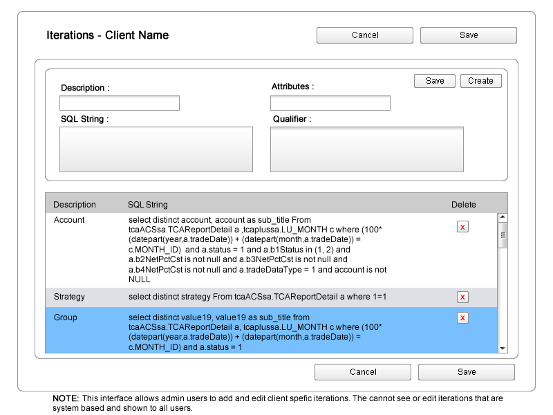 In summary, this is a tool that allows the internal client services team to create SQL updates through a GUI. Users select the values within a client report that they need to update, then the circumstances in which these values need to be changed.