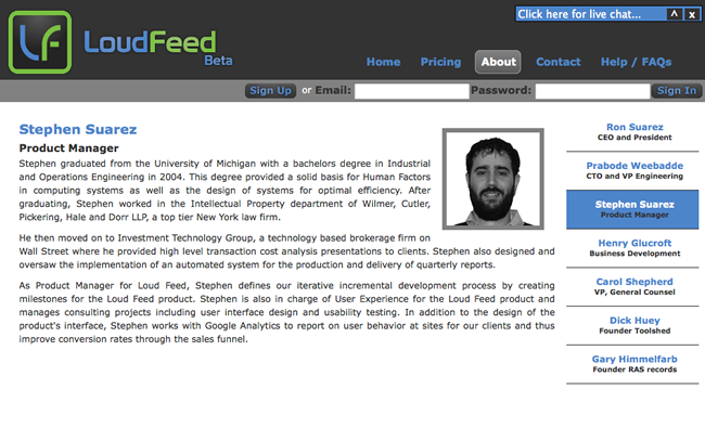 Previously, I was Product Manager at Loud Feed - a web based content management system for musicians and labels to promote and sell their music through custom websites and widgets. I was in charge of User Experience of the product, defined the iterative incremental development cycle, and was responsible for rapid prototyping of initial mockups (HTML/CSS/JavaScript) as well as creating wireframes and flow charts used in RFPs for consulting work.