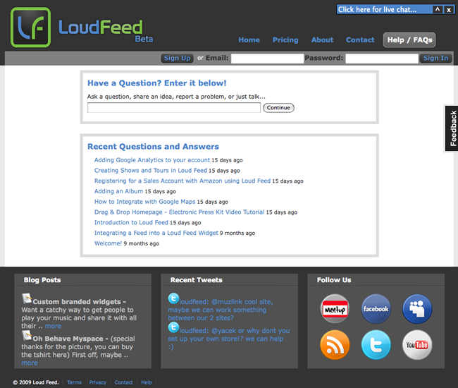I defined the iterative incremental development process, and was in charge of User Experience for the Loud Feed product. I helped make the application more approachable to novice artists by improving existing functionality, application feedback and ease of use. I designed the page and wrote all of the HTML/CSS, and javascript for the Loud Feed homepage.