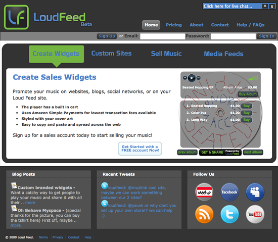An independent artist or label can set up its own online store and widgets in 20 minutes using the Loud Feed platform, and no commission is taken from their sales.